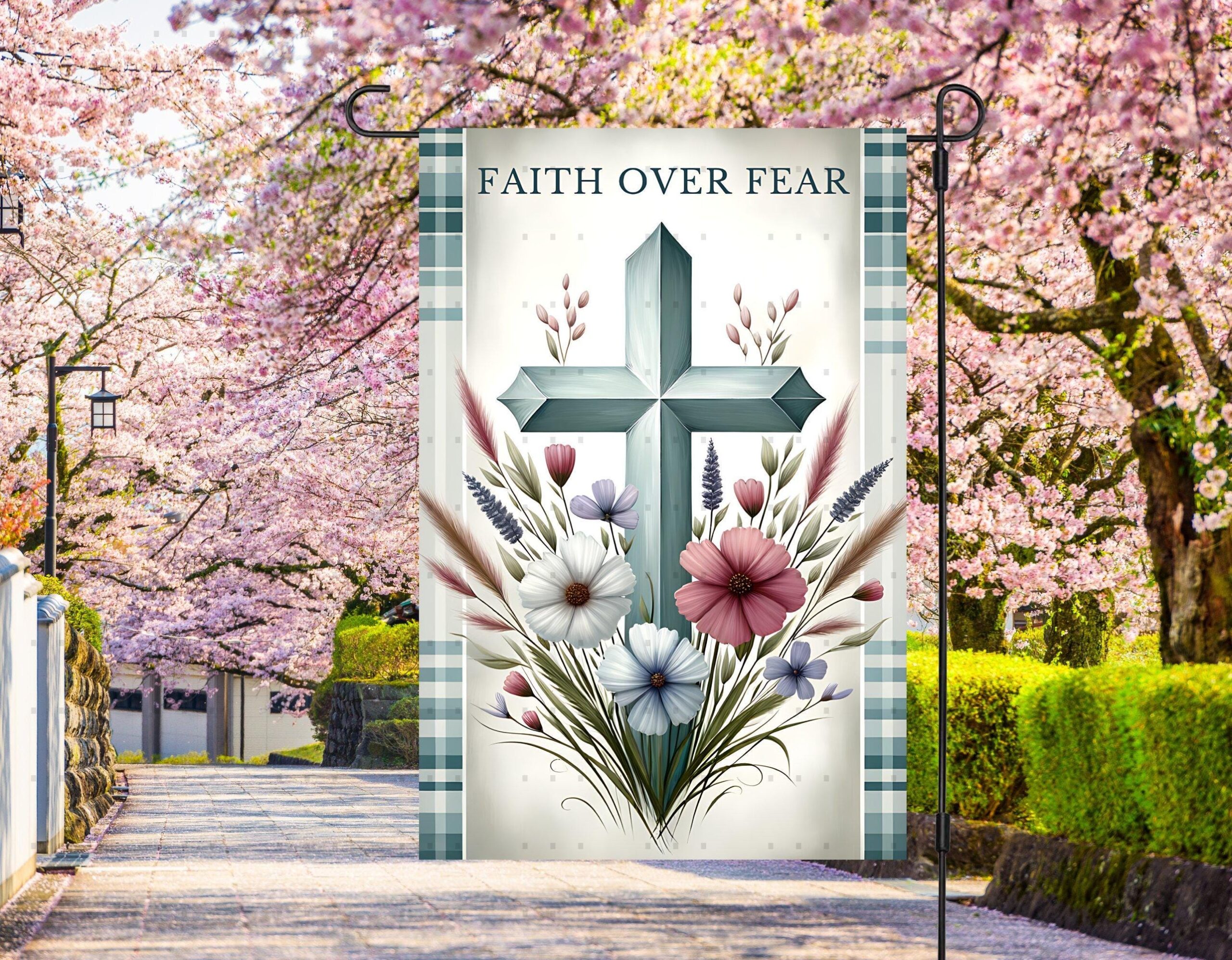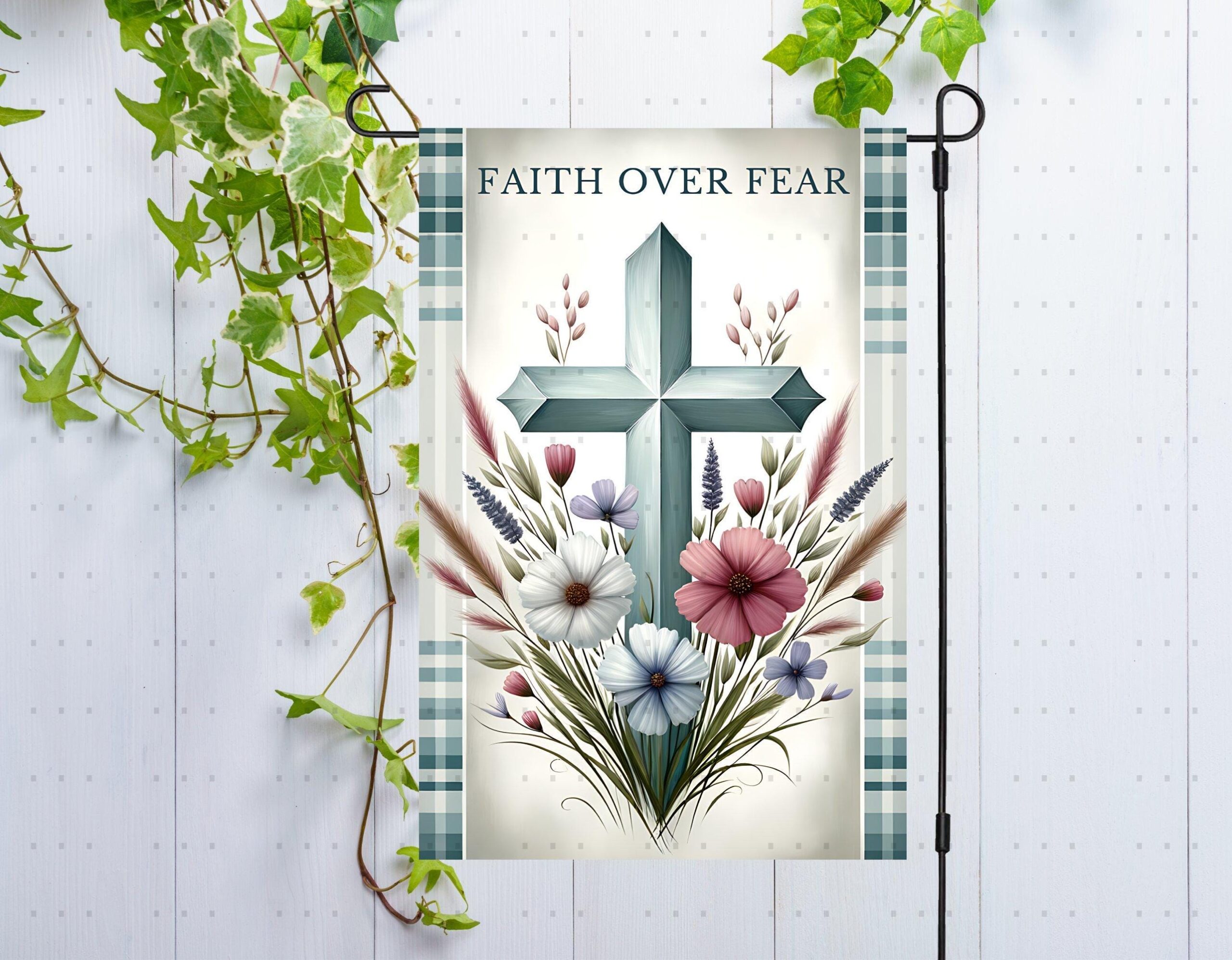 See the product images of the Christian Inspirational Garden Flag Yard Decor with Faith Over Fear Rustic - Weatherproof Spiritual Accent below:
