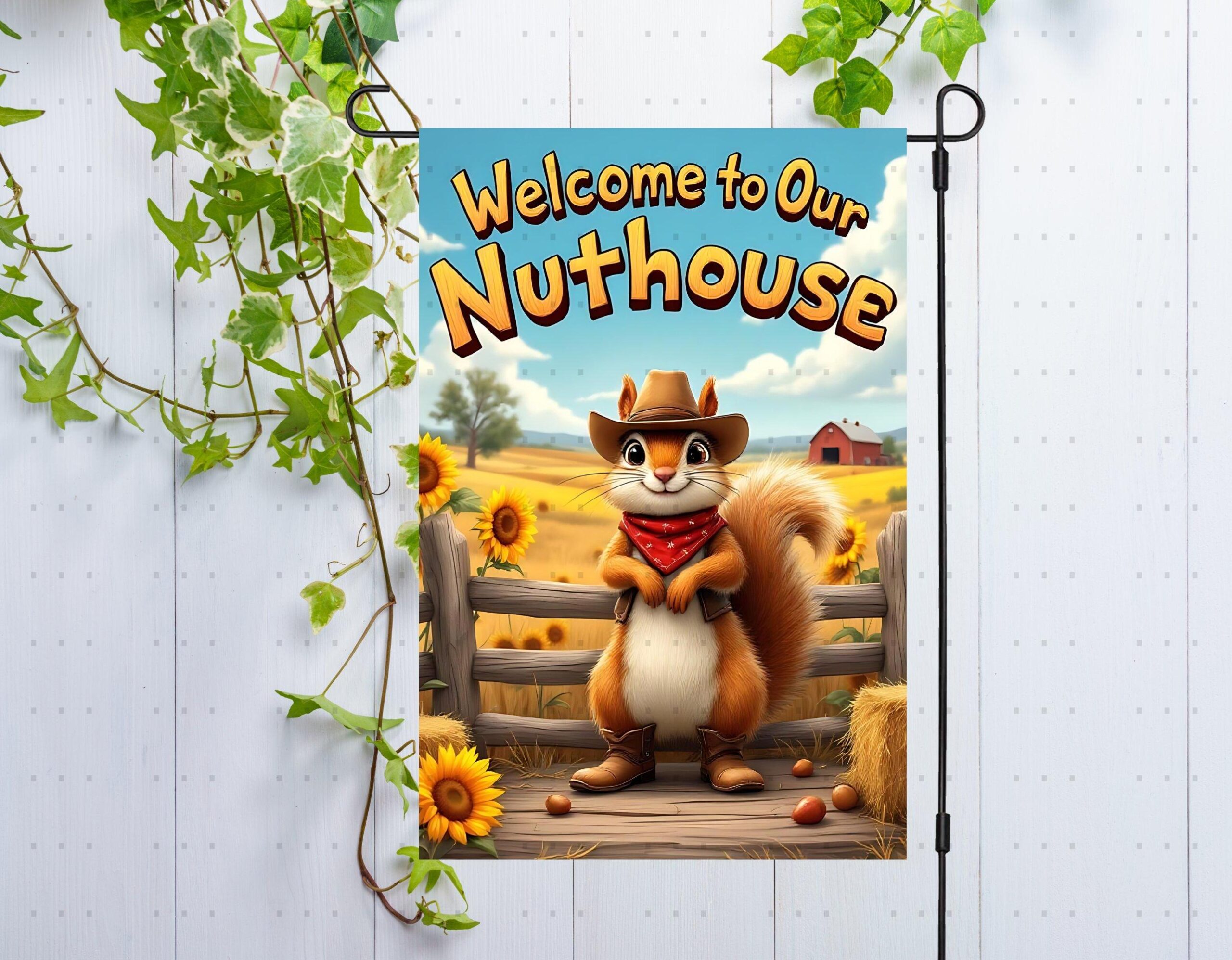 Garden Flag with Welcome to Our Nuthouse Squirrel – Outdoor Humor Yard Sign