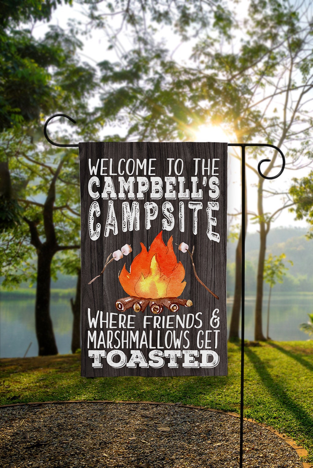 Personalized Welcome to the Campbell’s Campsite Where Friends & Marshmallows Get Toasted Garden Flag – Custom Camping Fun for Outdoor Memories