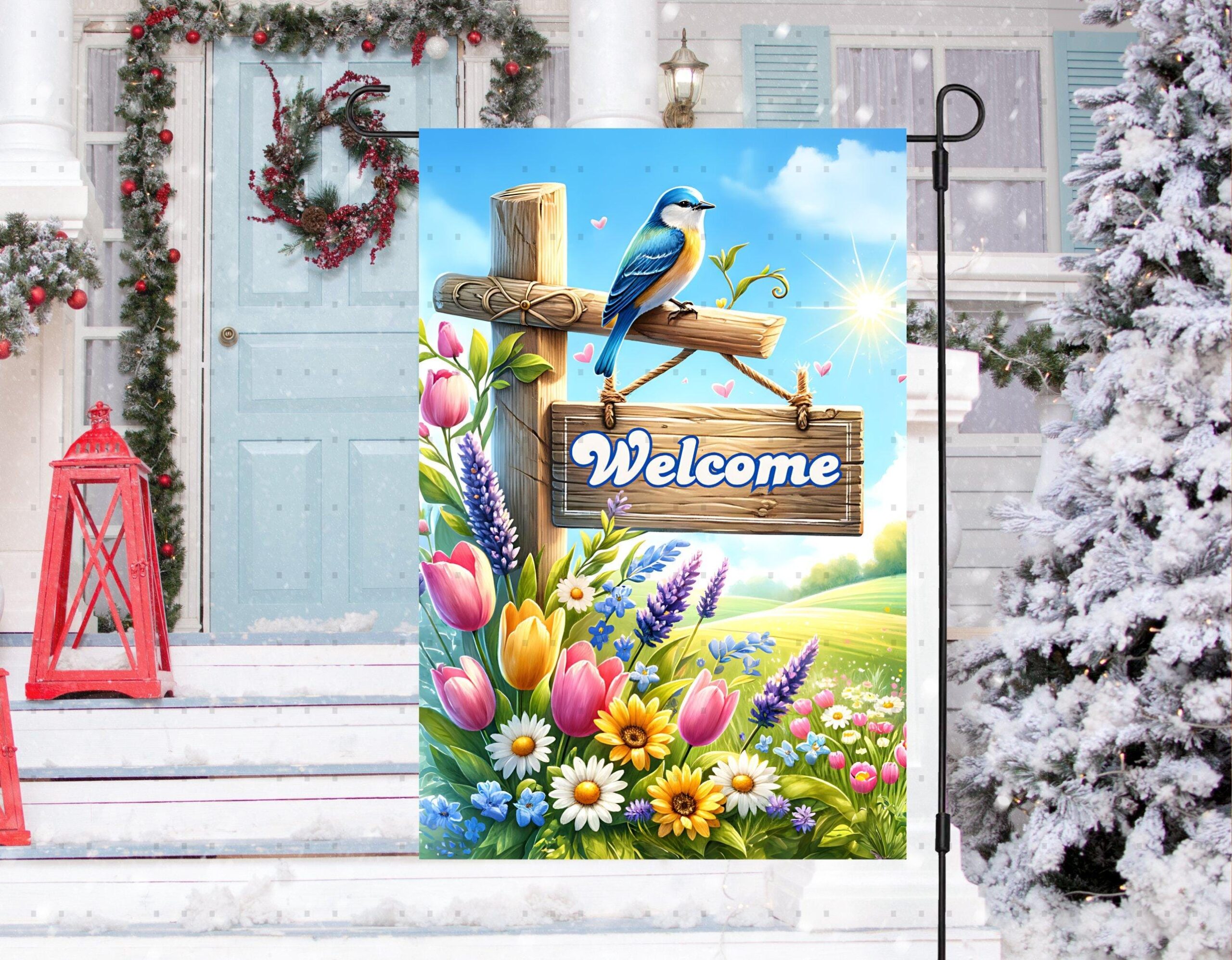 Welcome Garden Flag Spring Yard Decor with Flowers Bird and Sun – Weather-Resistant Rustic Accent