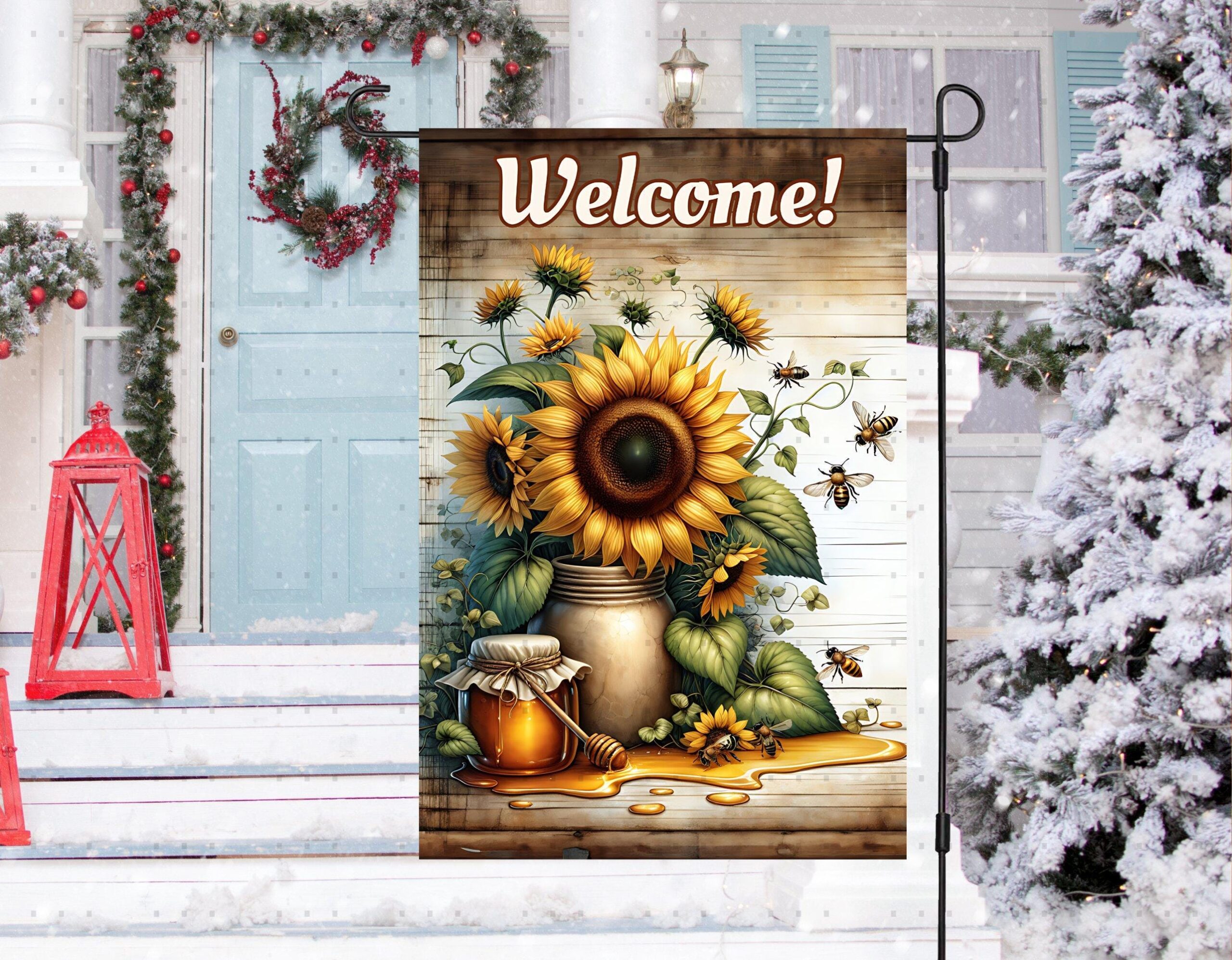 Welcome Garden Flag Yard Decor with Sunflower Honey Bees and Rustic Wood – Weather-Resistant Country Accent